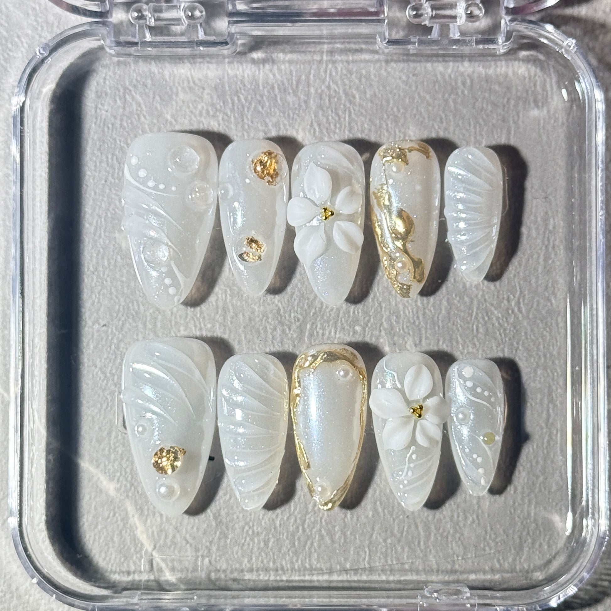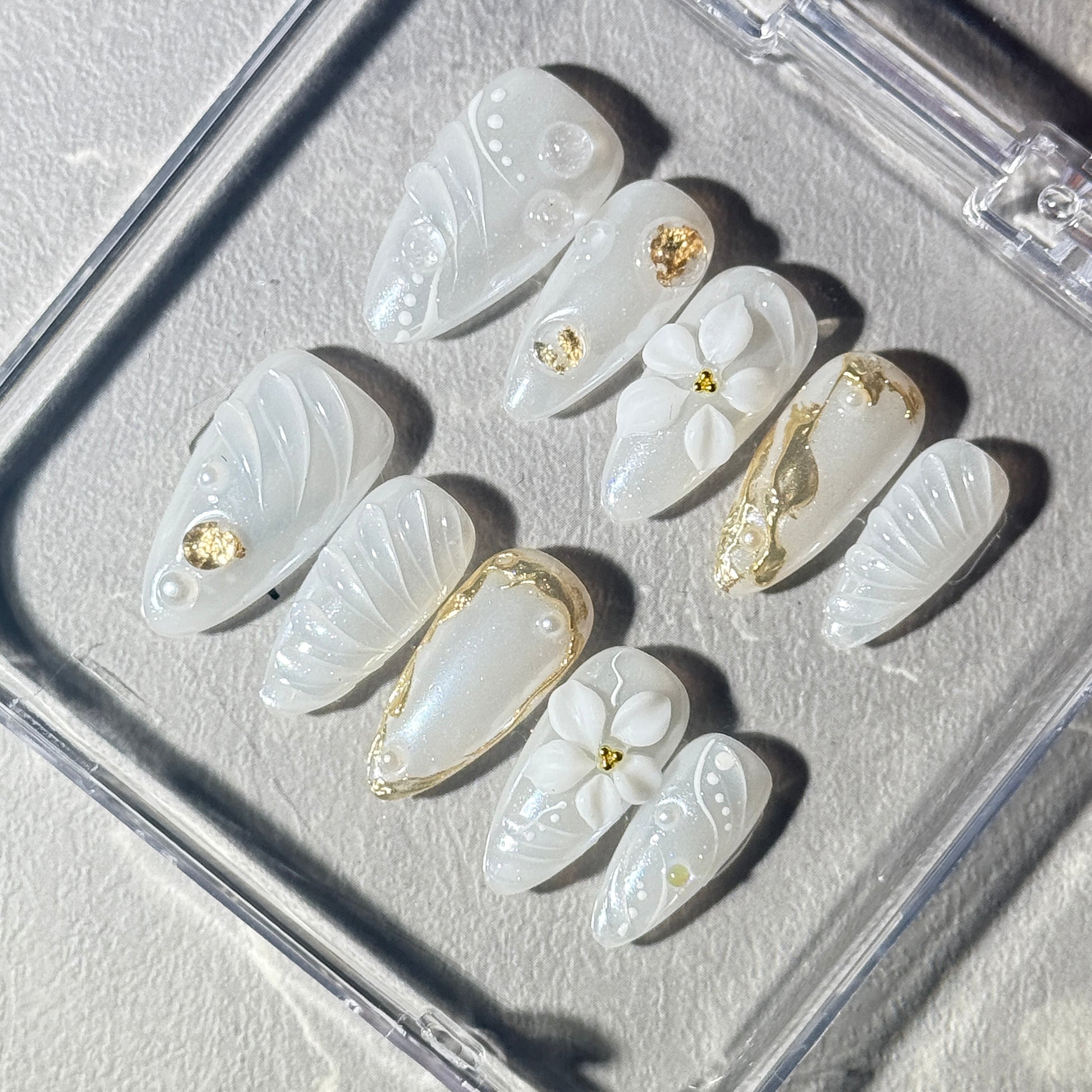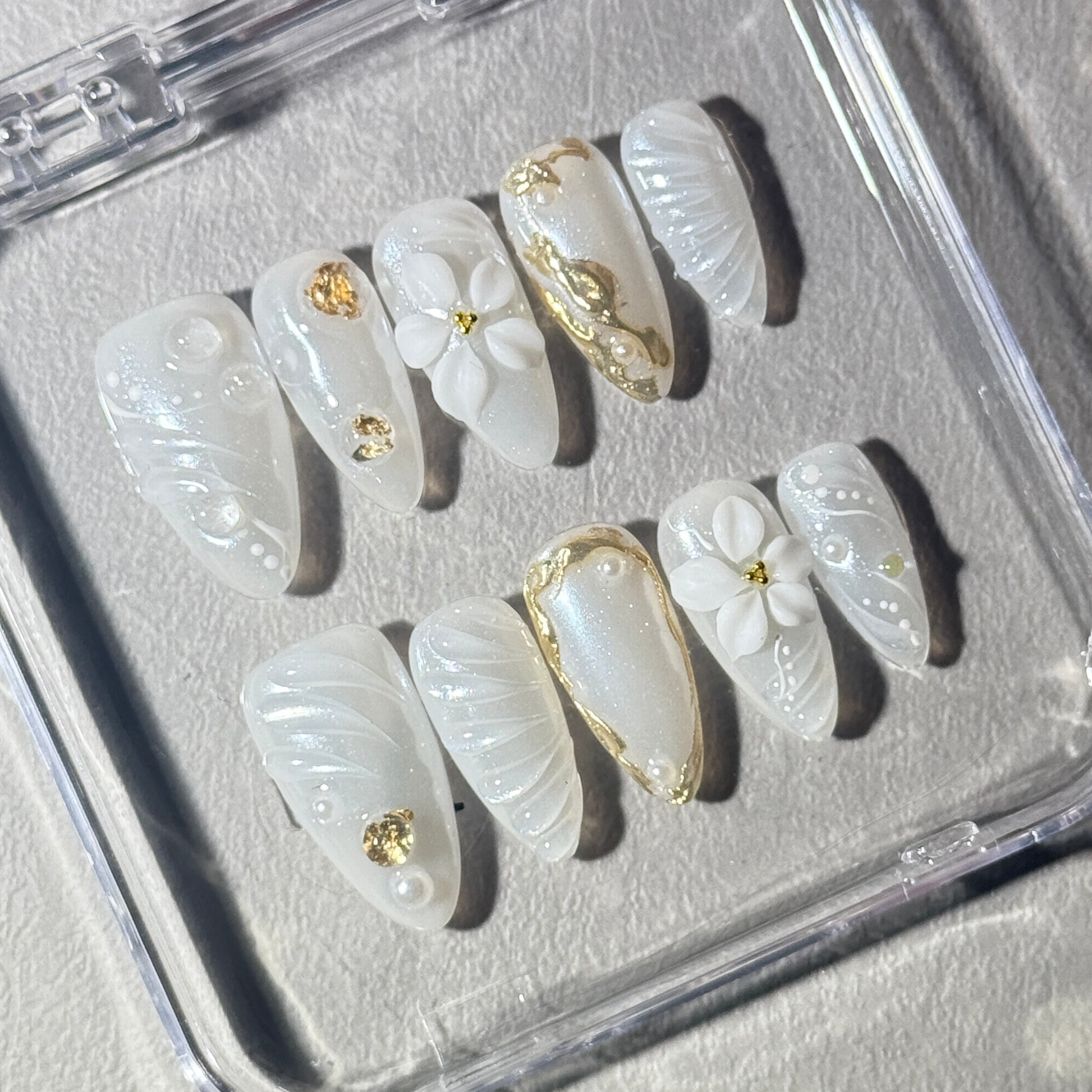 “A dreamy white aurora shimmer base with delicate golden accents. Enhanced by transparent 3D lines for a lightweight, dimensional effect, and finished with hand-painted 3D white florals — like blossoms blooming in snow, pure and ethereal.Good for wedding!”
