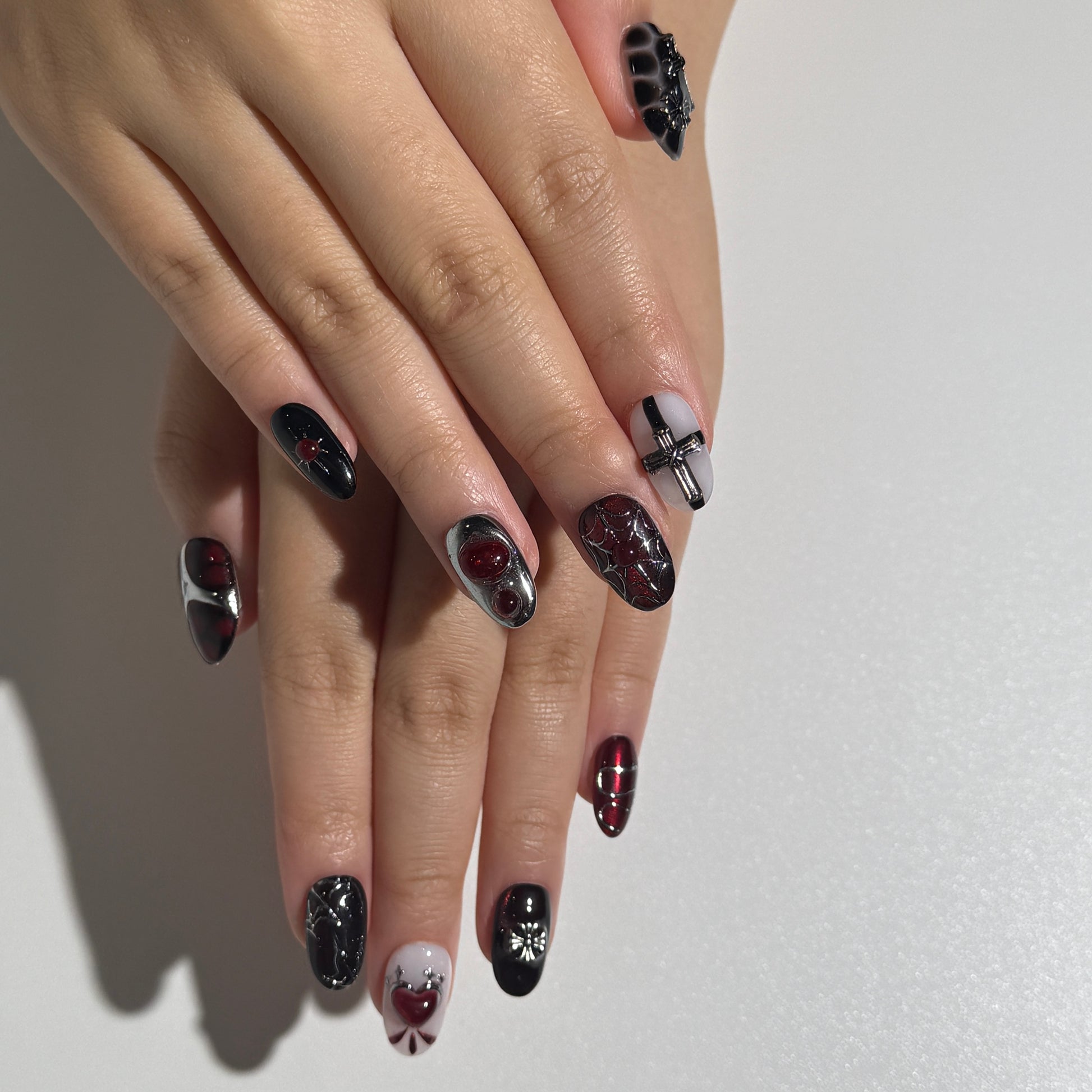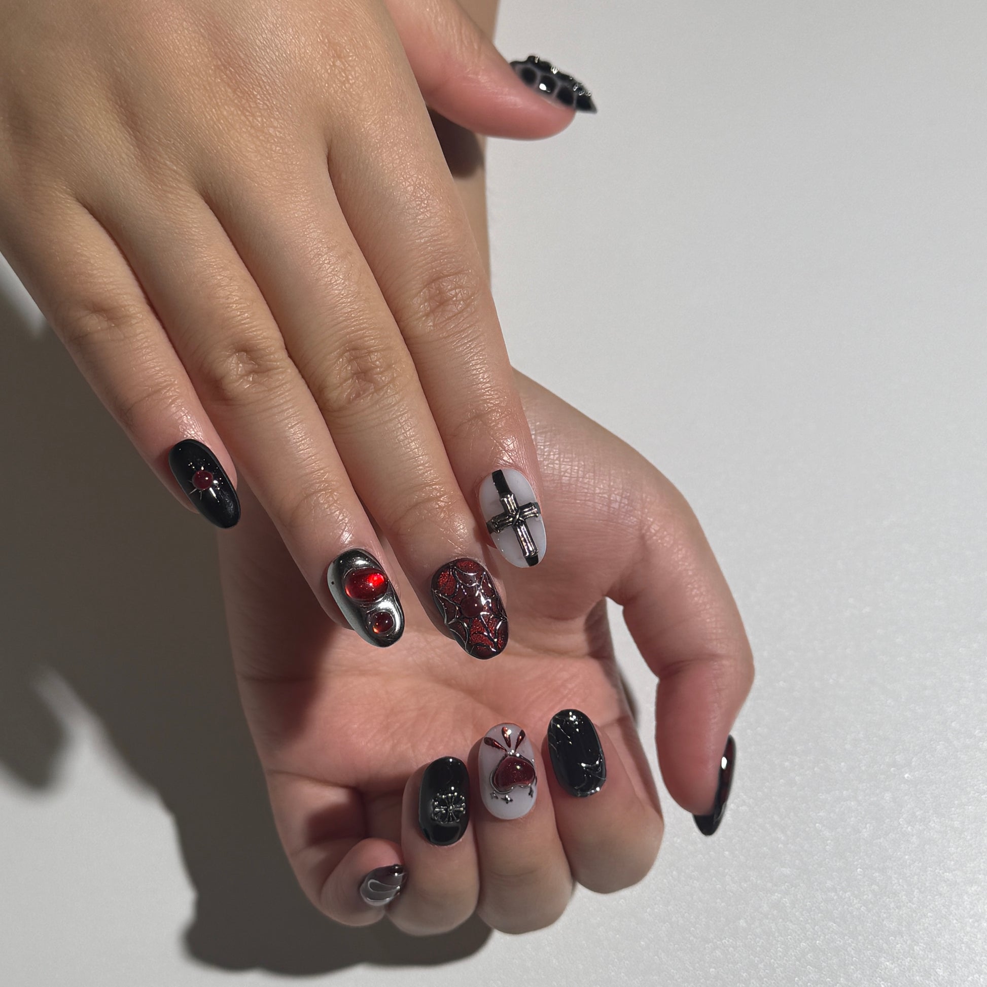 Celebrate Halloween with these intricately designed press-on nails that blend playful spookiness with luxury. Featuring a fusion of classic Halloween motifs and avant-garde artistry, this set is crafted for those who dare to stand out.