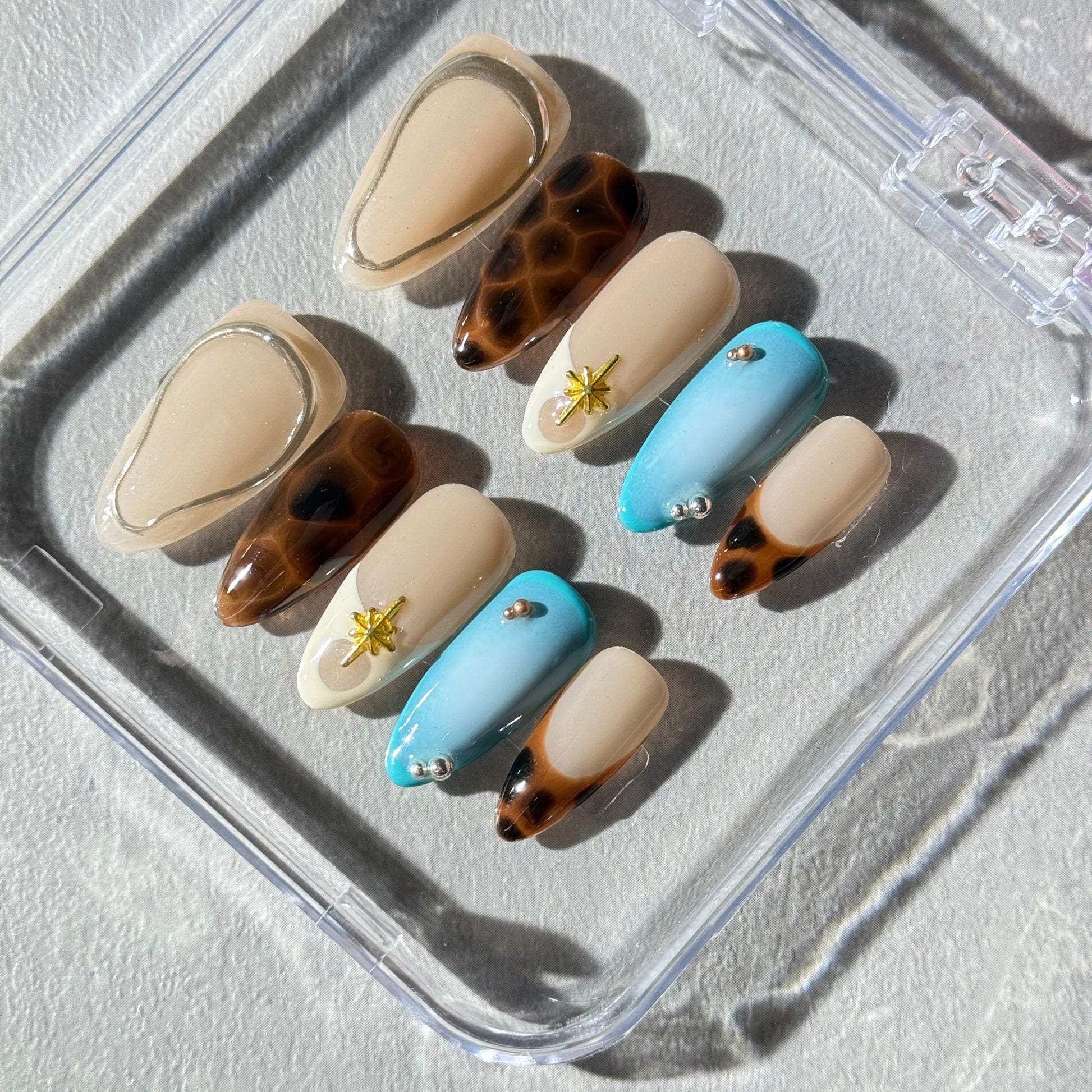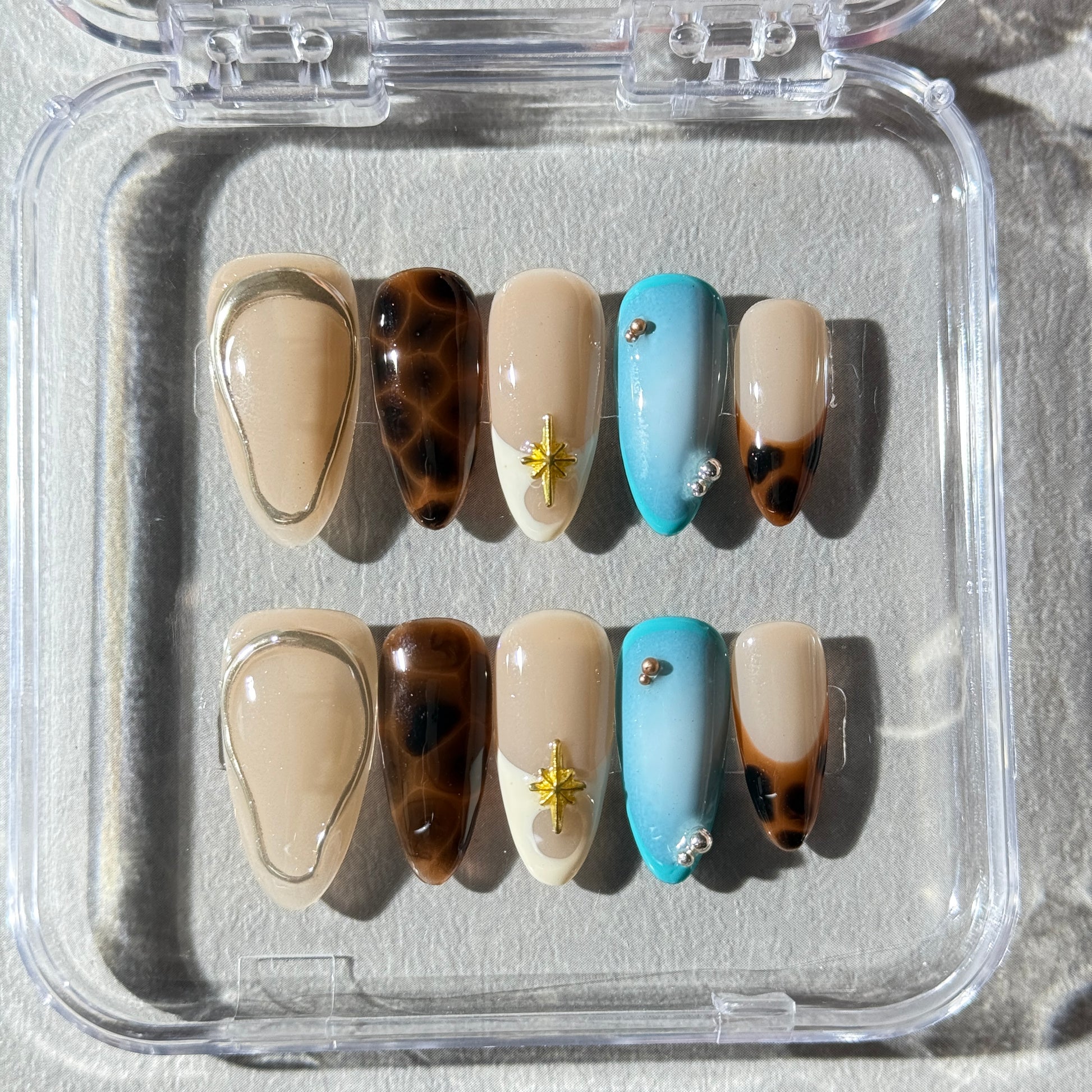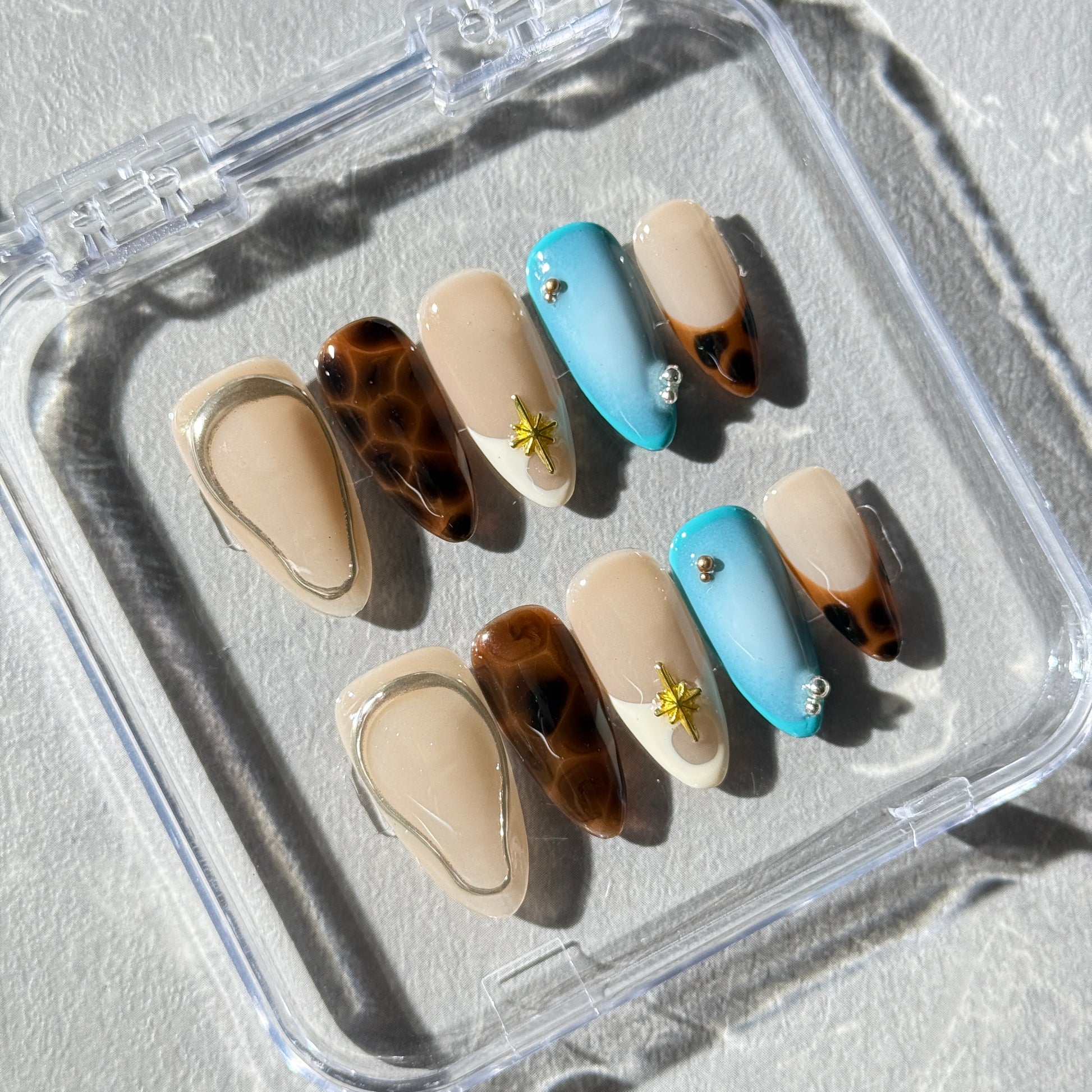 Inspired by earthy tones and desert sunsets, Desert Mirage blends tortoiseshell patterns with nude beige and a pop of turquoise blue. Subtle gold and crystal embellishments add a modern, sun-kissed charm — perfect for a chic everyday look or a minimalist luxury vibe.