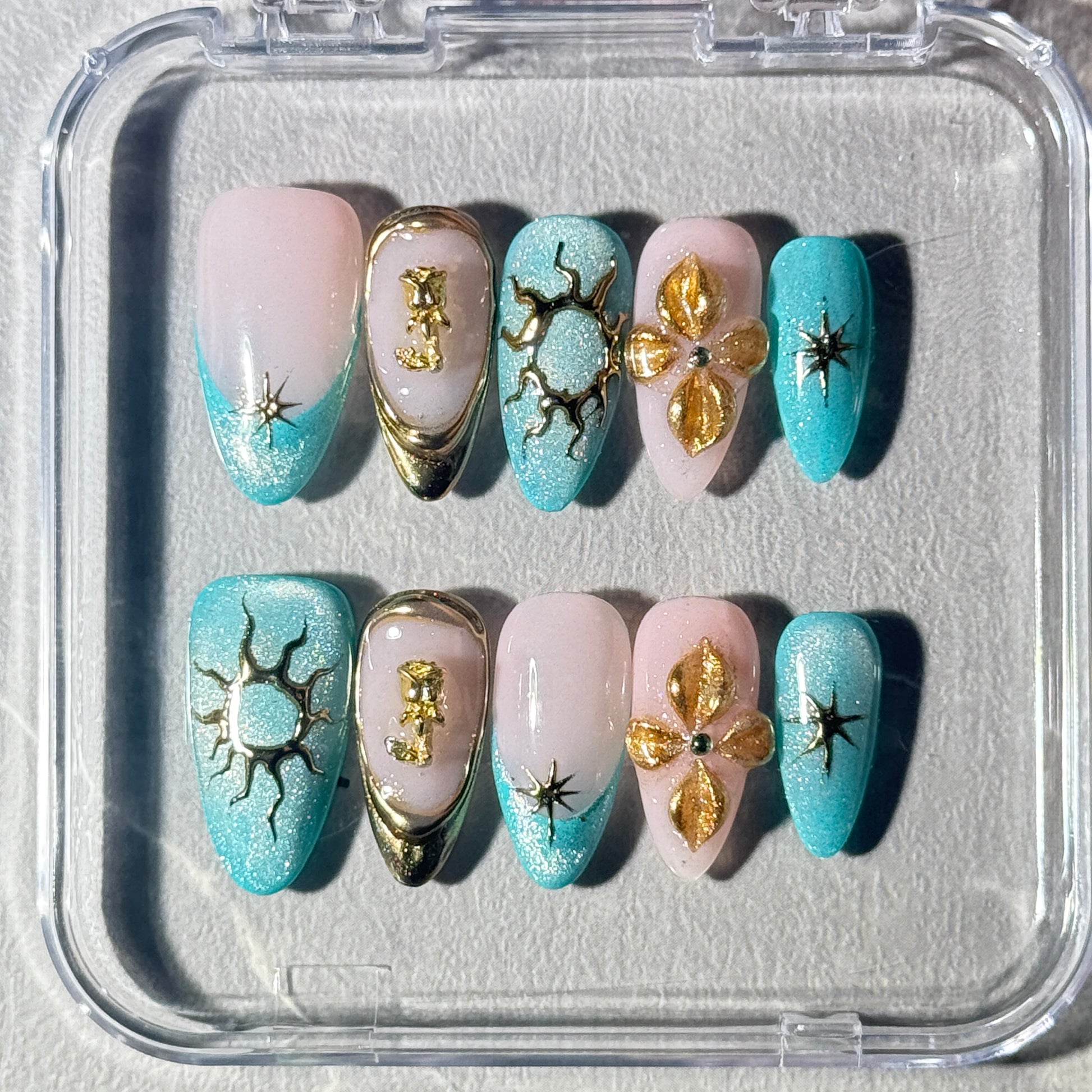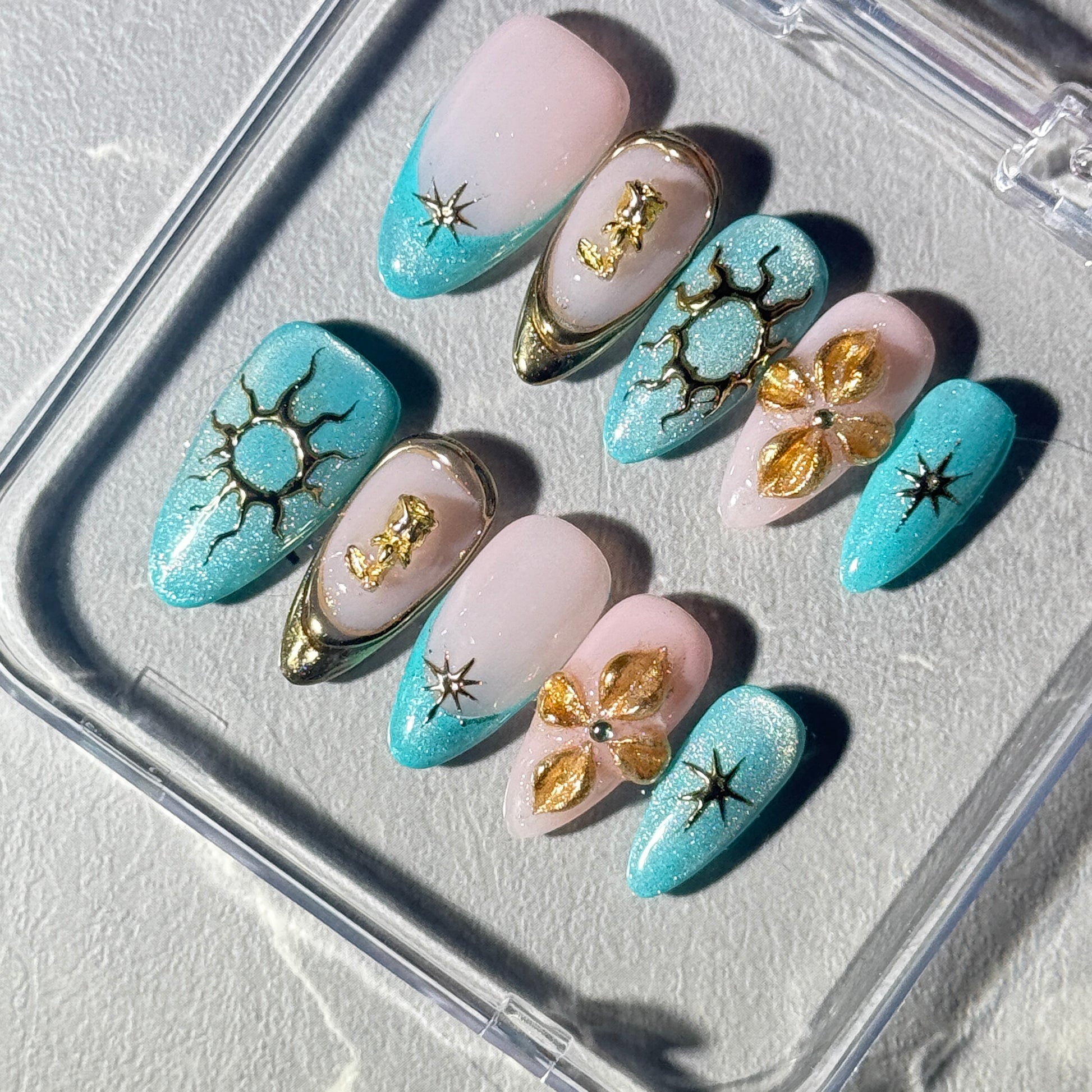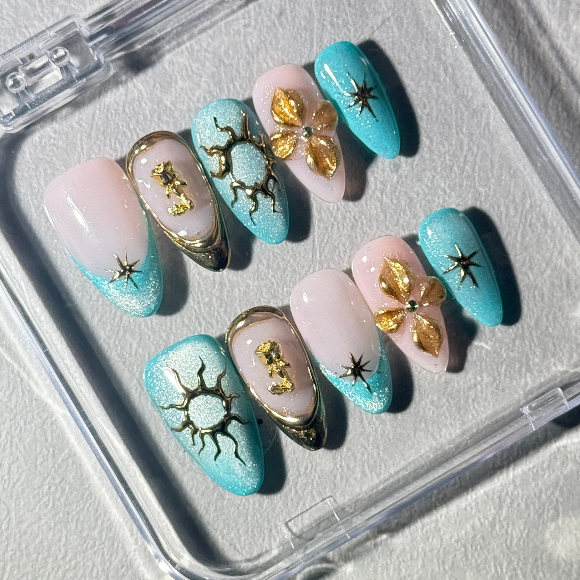 “A mesmerizing blue cat-eye base with a mysterious shimmer, adorned with elegant golden roses and delicate hand-painted 3D floral accents. Finished with celestial touches of the sun and stars, combined with a chic French tip design — perfect for a sophisticated yet dreamy look.”