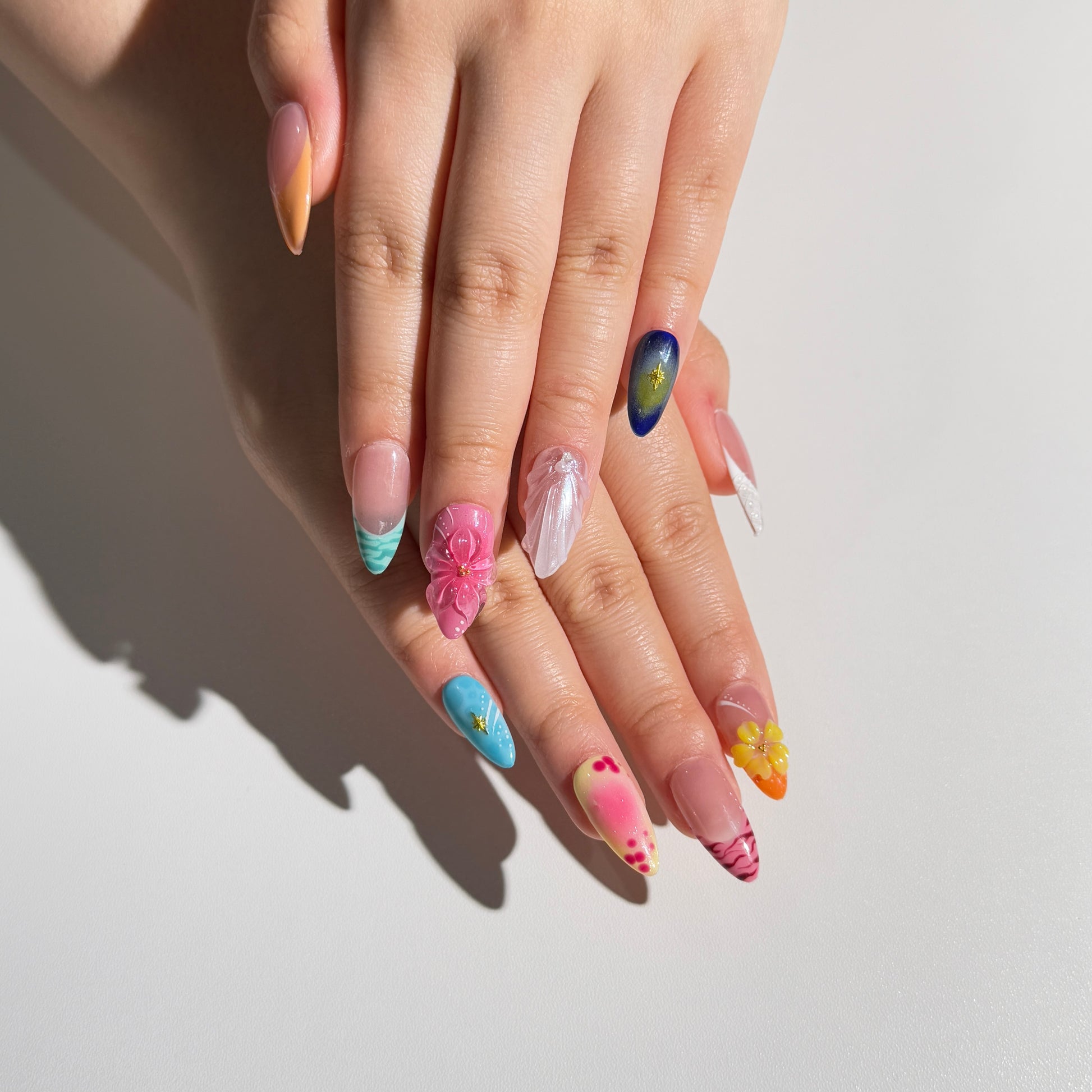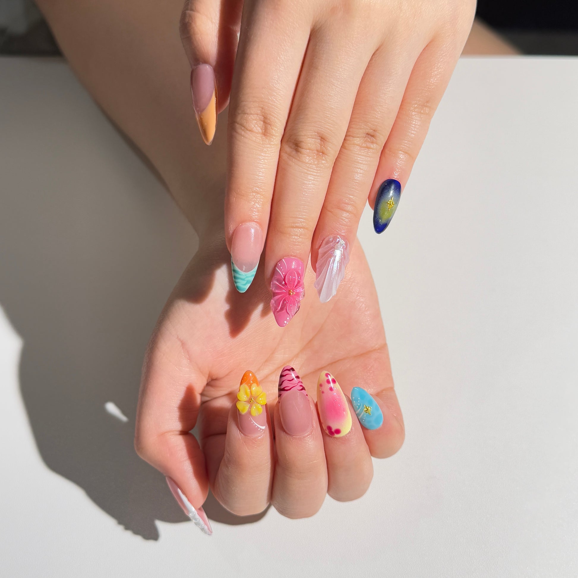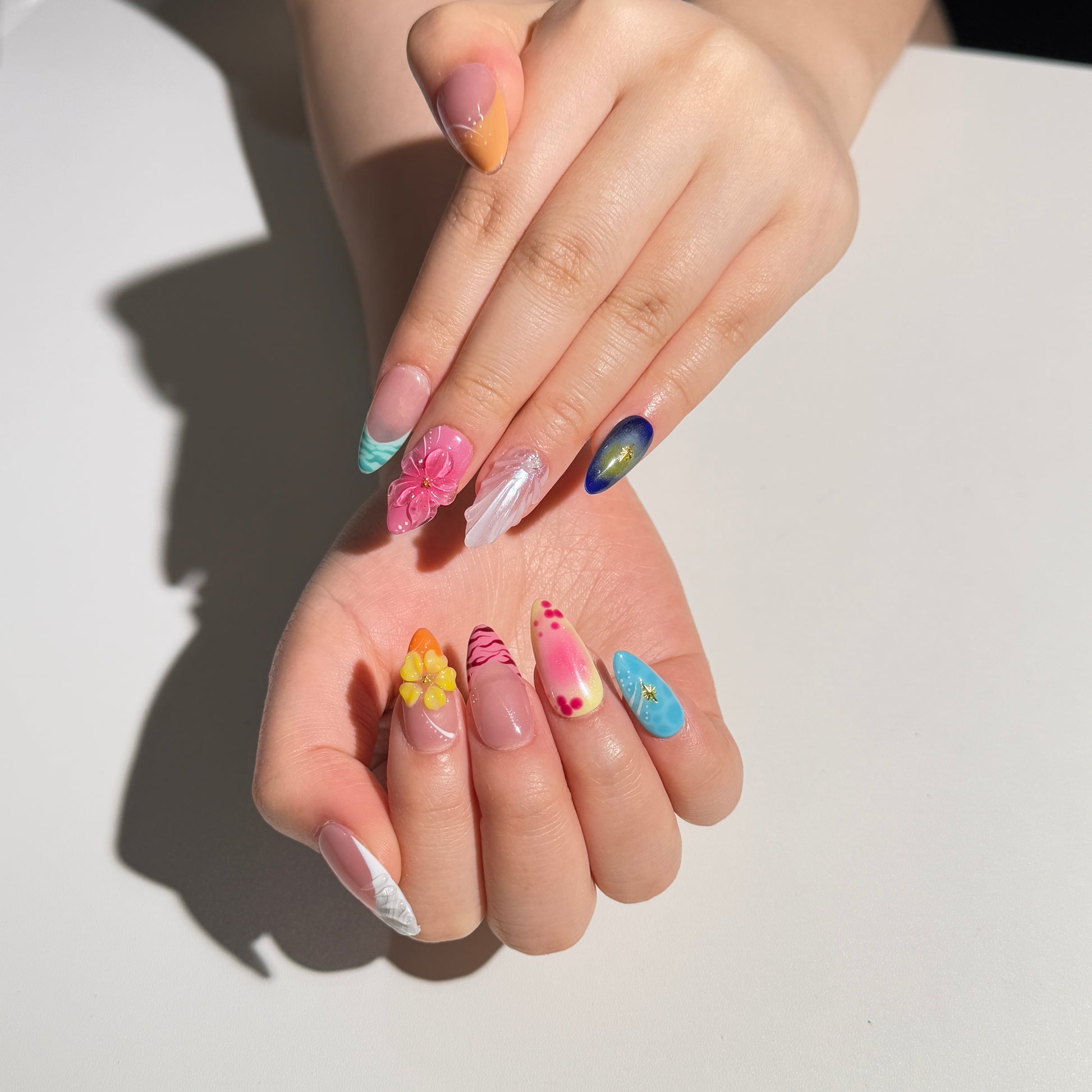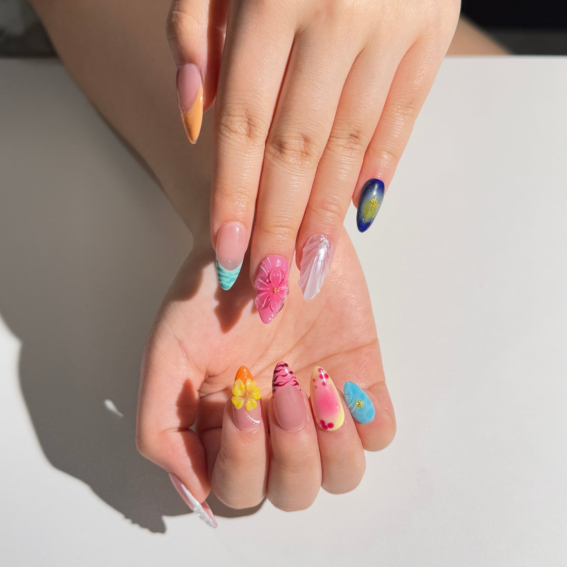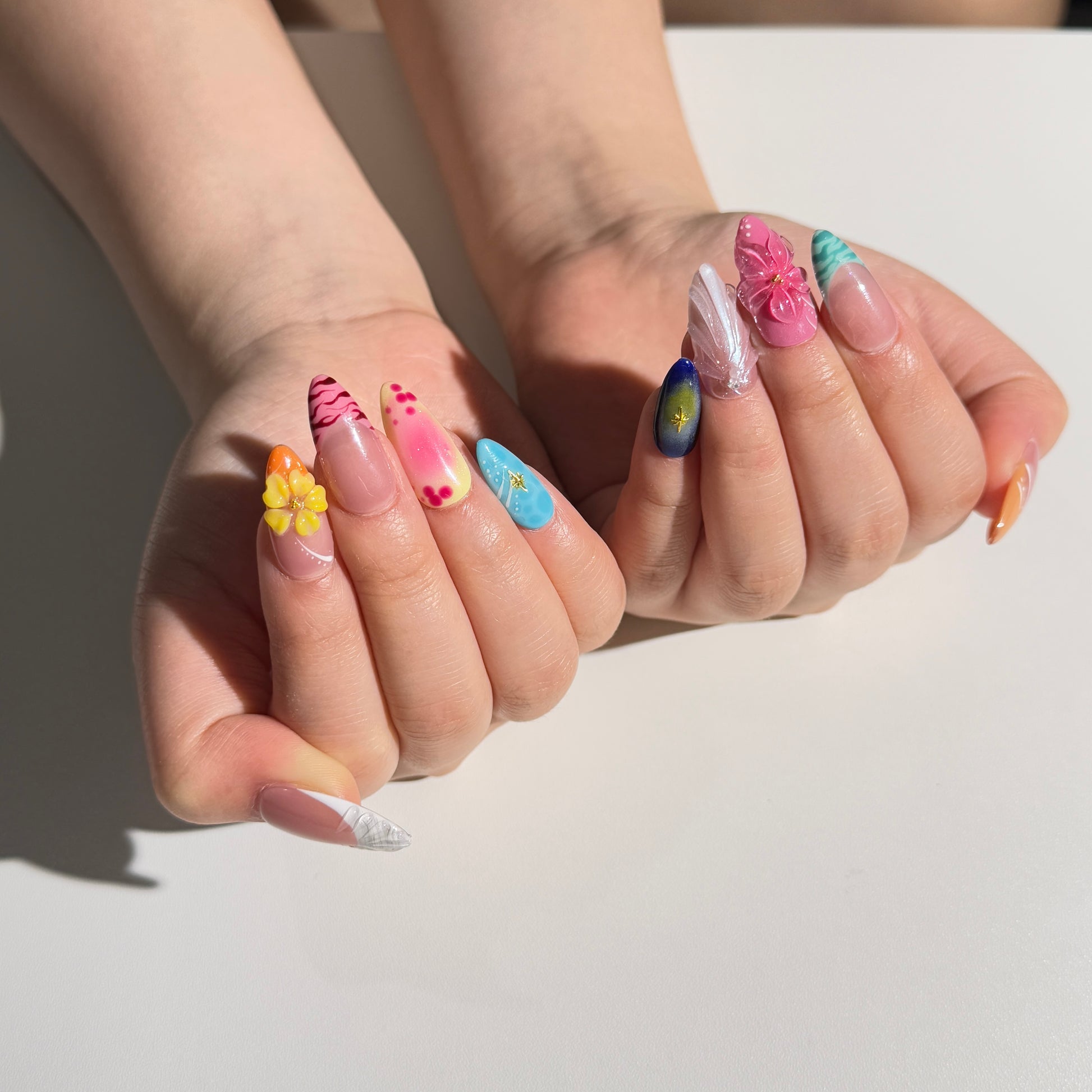 Embrace the joy of summer with these vibrant 3D floral nails in sunshine yellow and bubblegum pink! Hand-sculpted 3D flowers pop off the nails with playful dimension, while a glossy finish makes them look juicy and fresh. The high-energy color combo instantly boosts your mood, perfect for beach trips, music festivals, or just adding a dose of happiness to your everyday style.