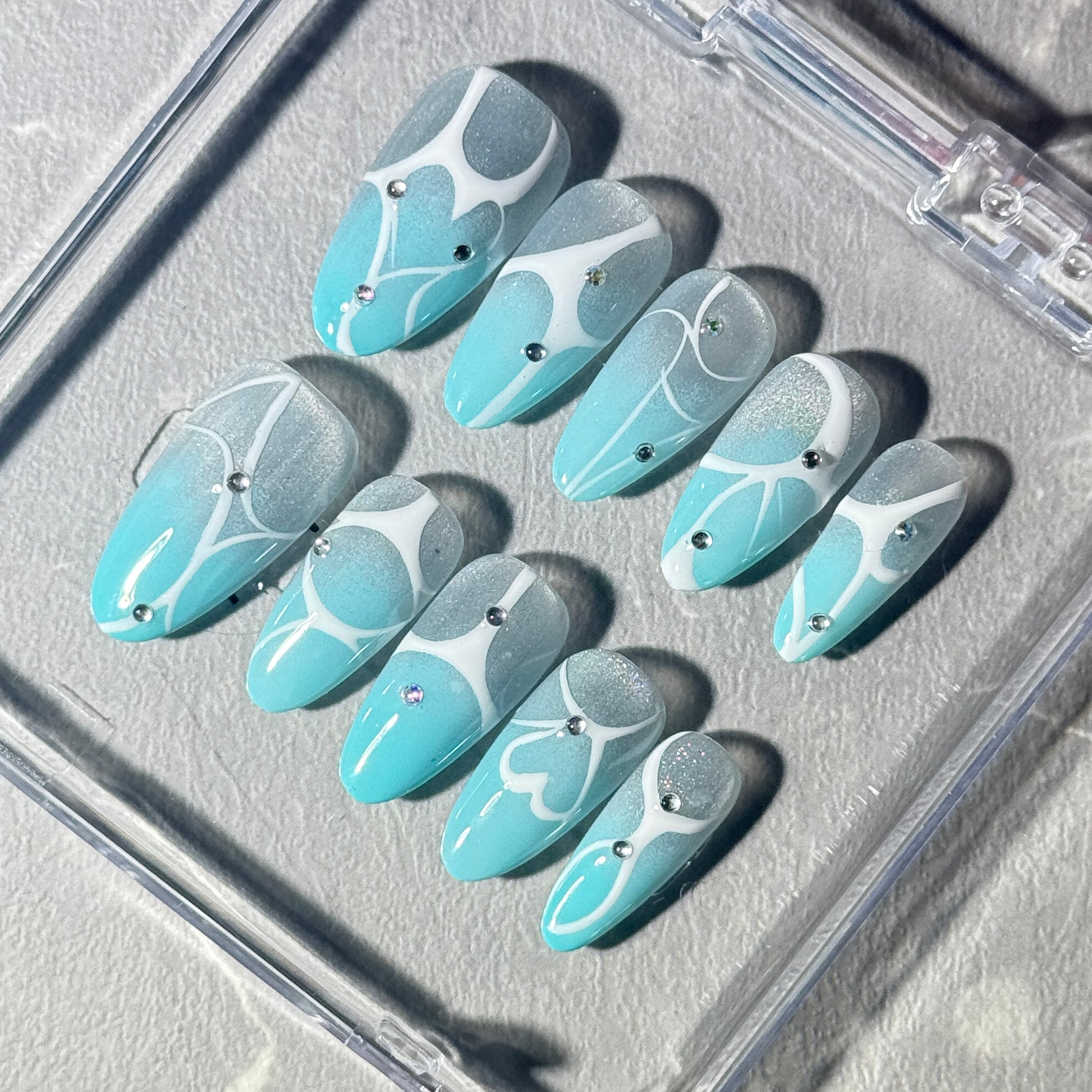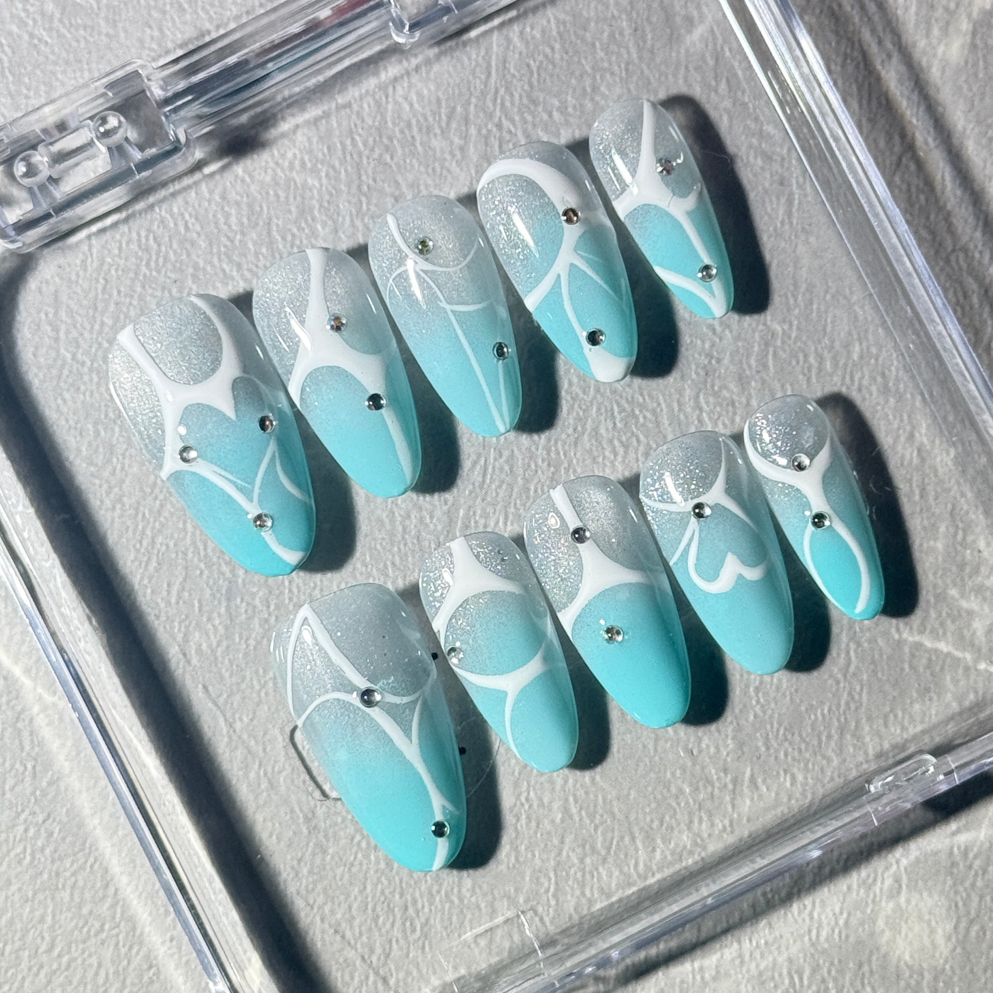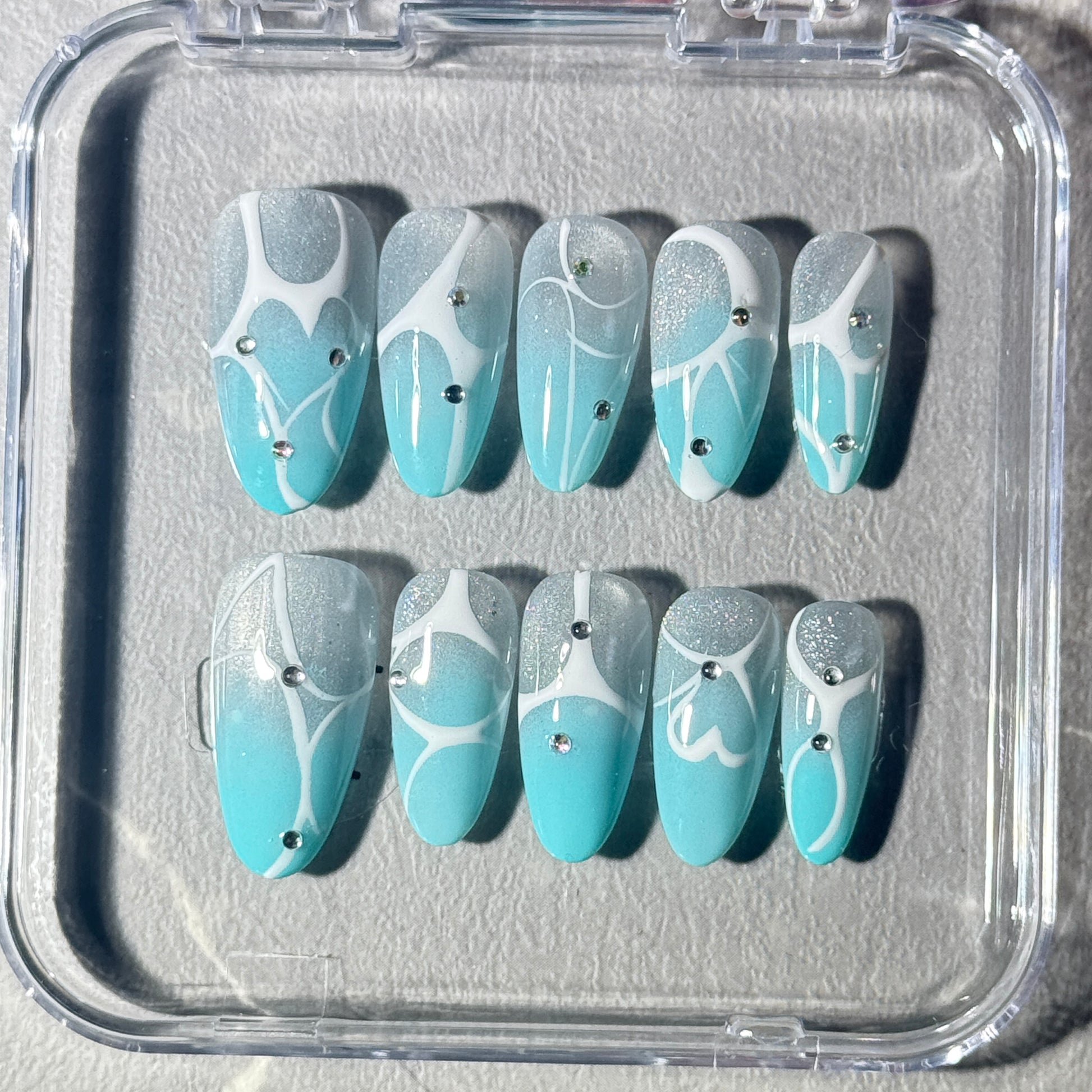 A refreshing aqua blue gradient base with delicate cat-eye shimmer, reminiscent of sparkling lake water. Accented with hand-painted white lines and tiny rhinestones for a touch of refined elegance.