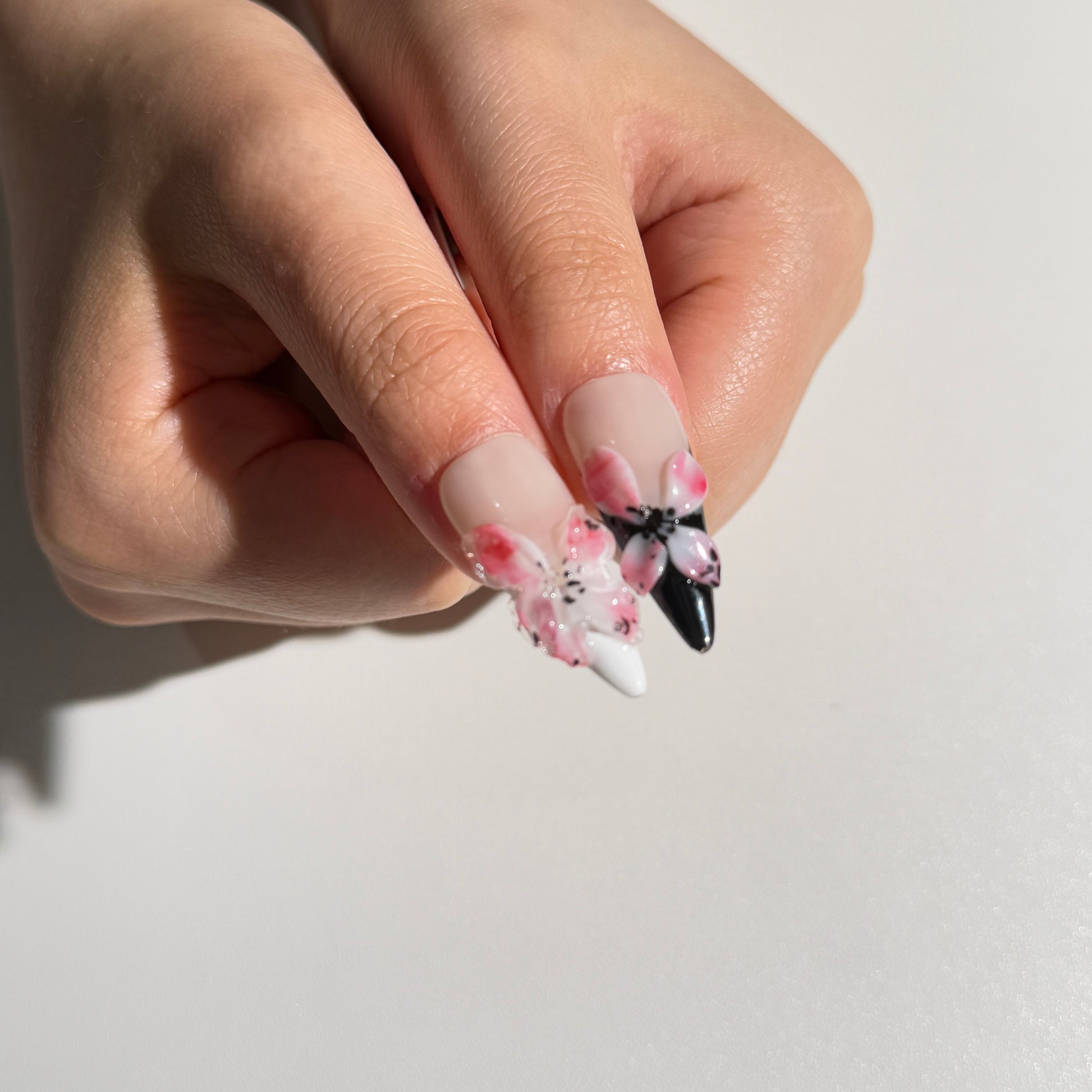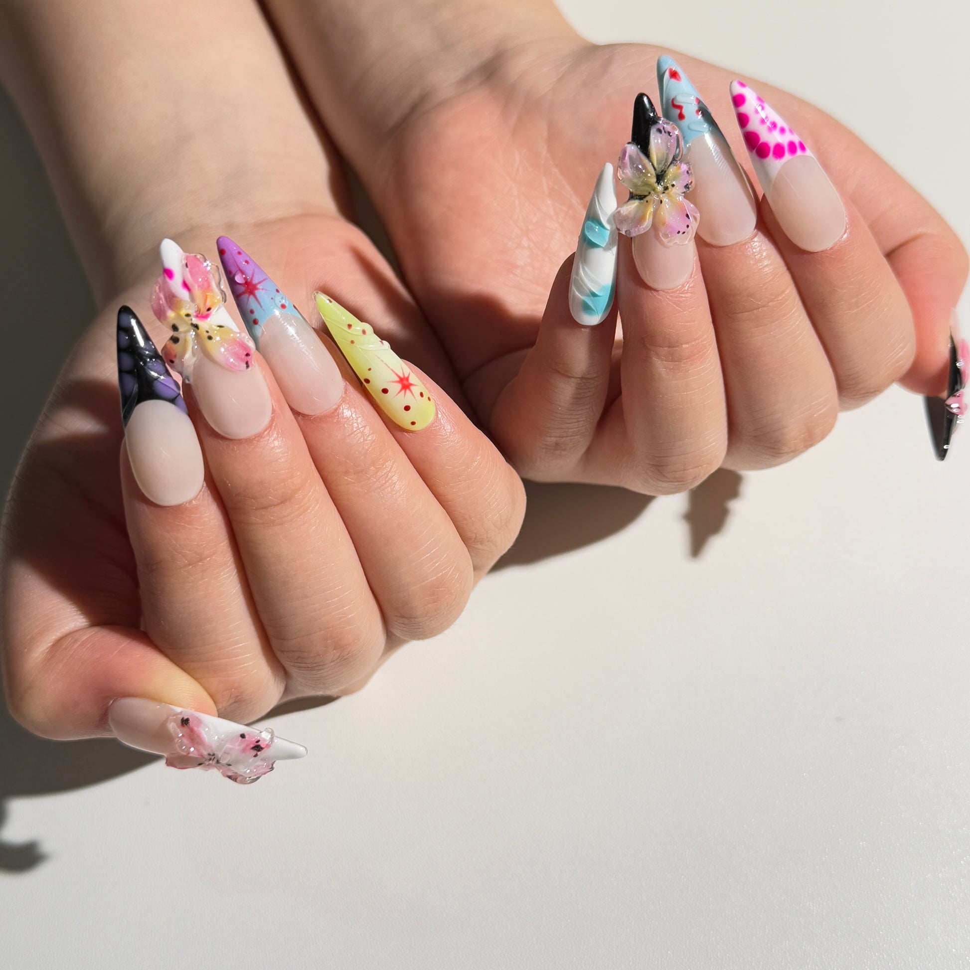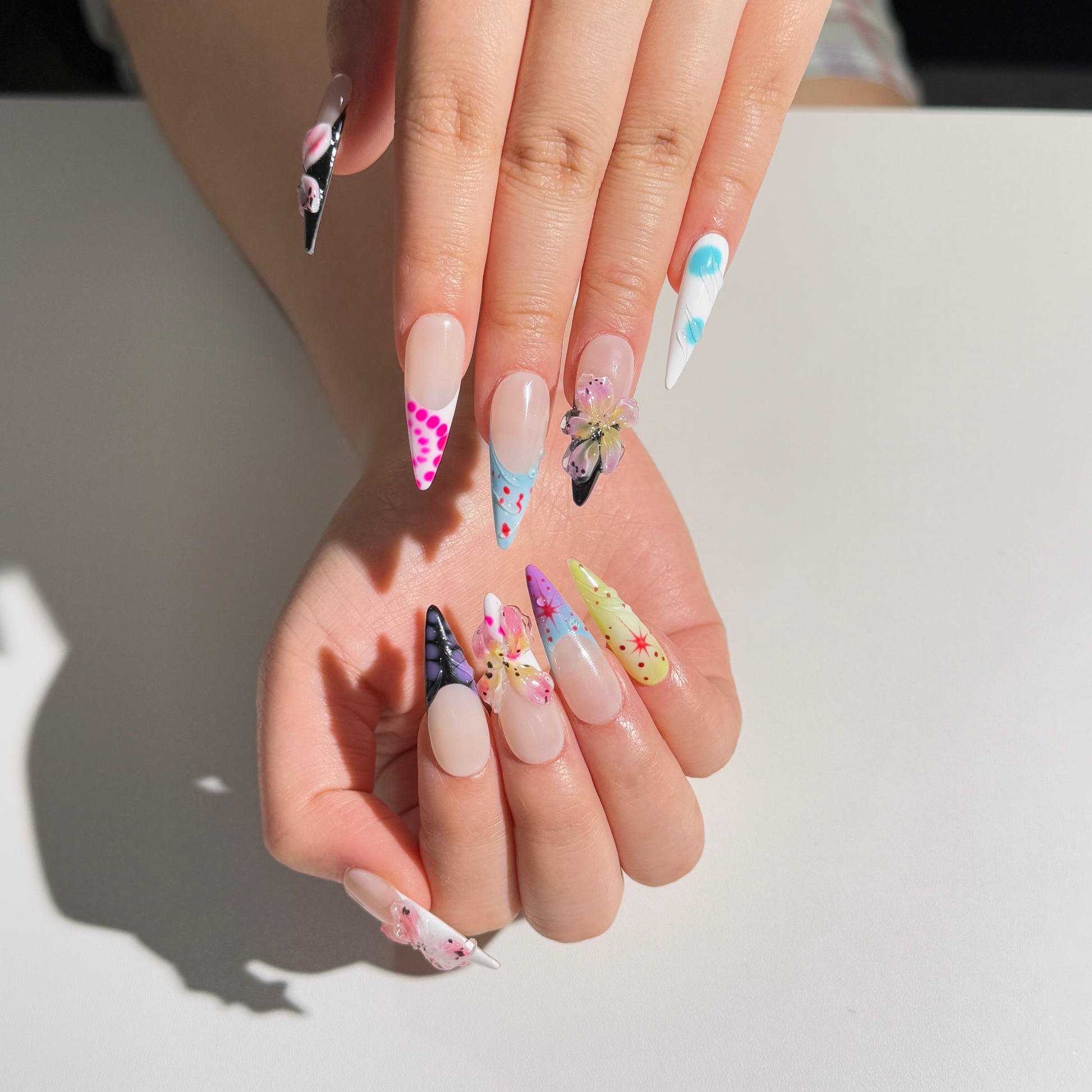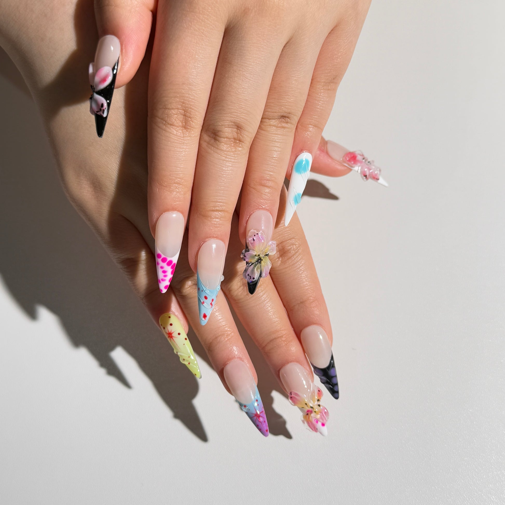 Brighten your summer with these"Dopamine 3D Floral French Nails" - a playful twist on the classic French manicure! The design features vibrant neon tips (think electric orange, hot pink, or lime green) paired with tactile 3D miniature flowers that seem to bloom right on your nails. Each petal is hand-sculpted with glossy gel for a juicy, candy-like effect, while pops of holographic glitter in the flower centers catch the light.