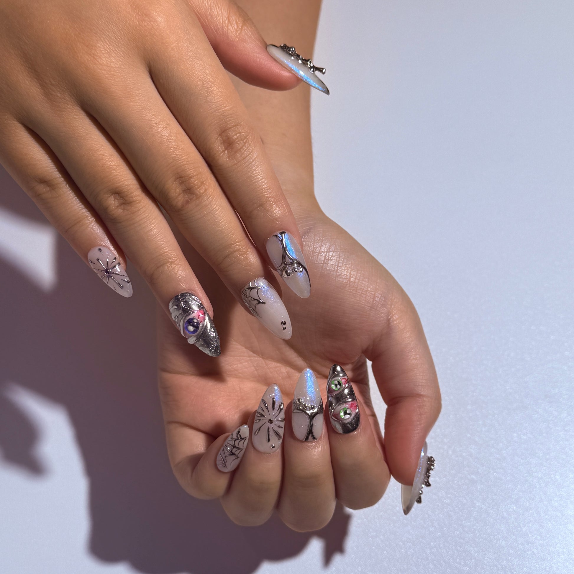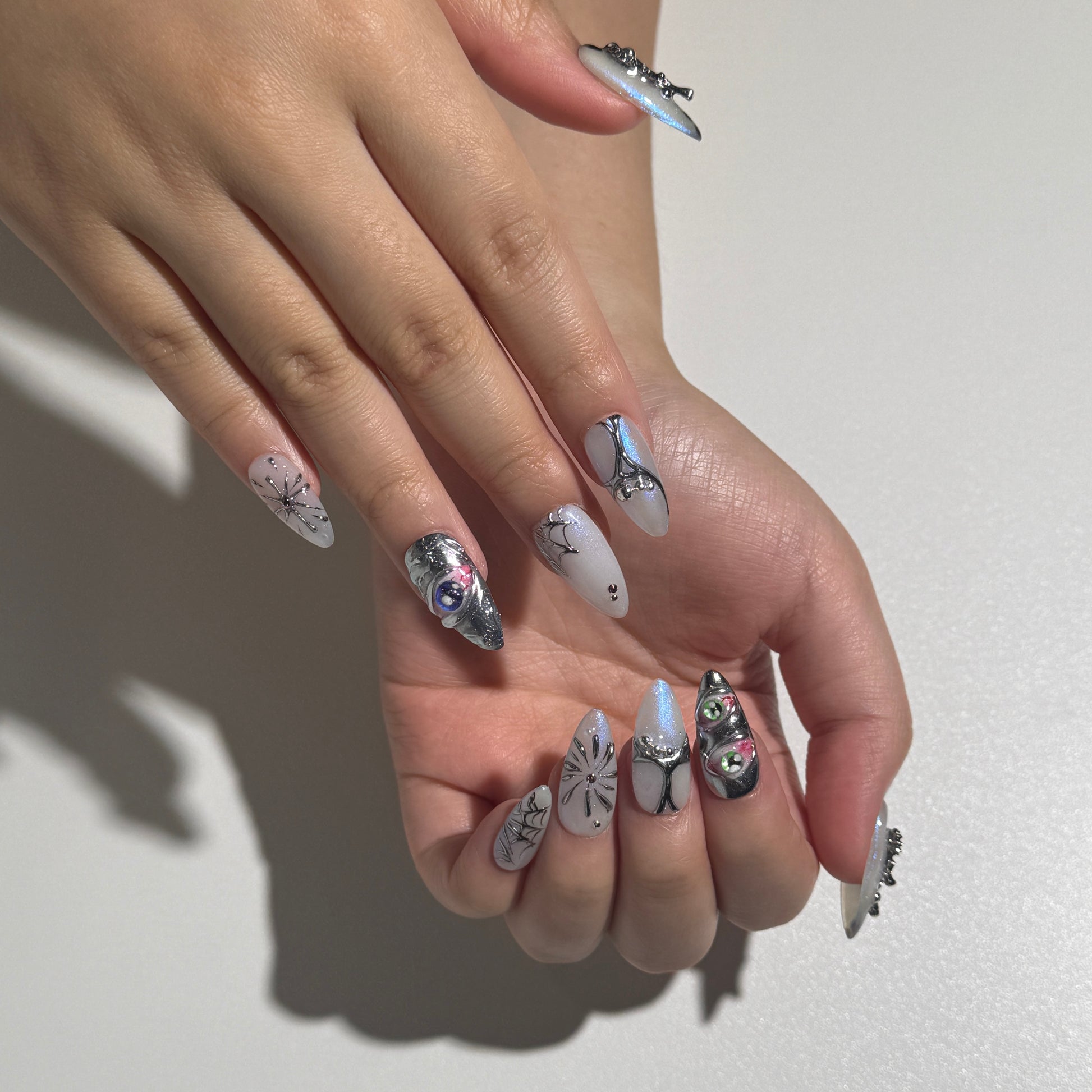 Celebrate Halloween with these intricately designed press-on nails that blend playful spookiness with luxury. Featuring a fusion of classic Halloween motifs and avant-garde artistry, this set is crafted for those who dare to stand out.