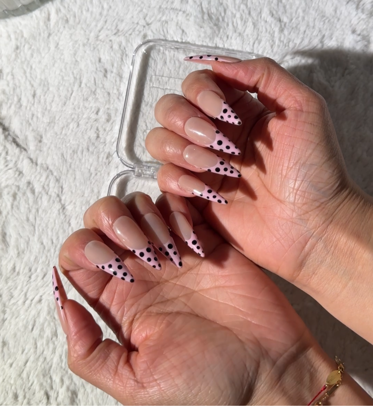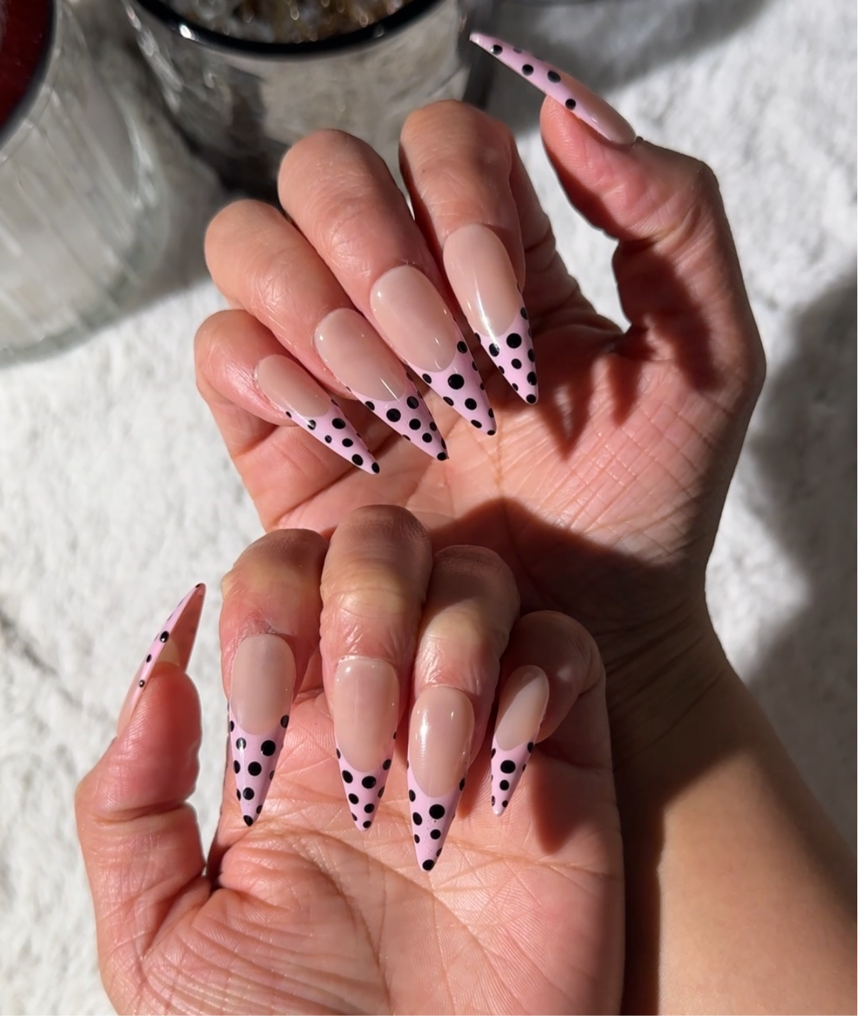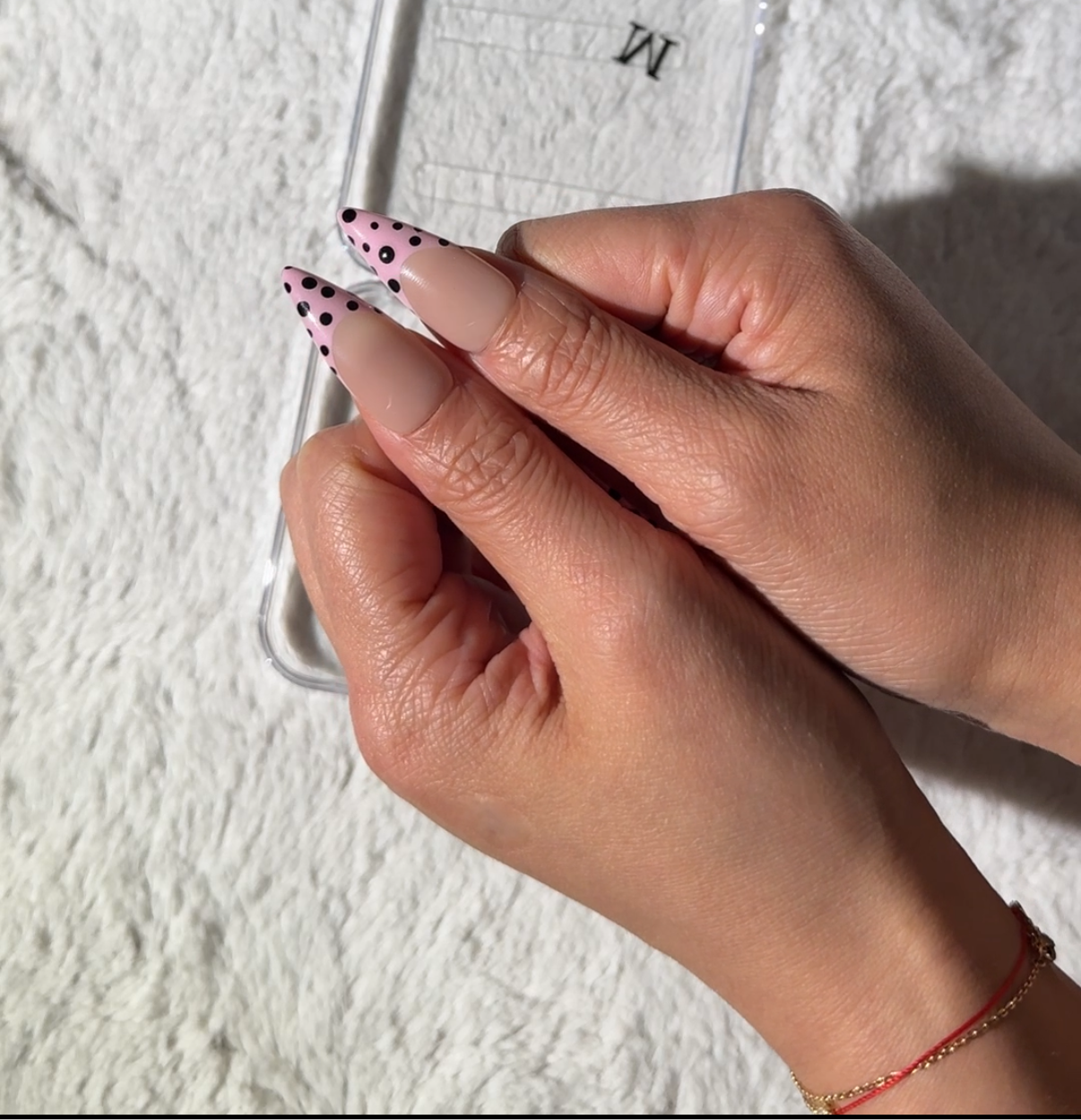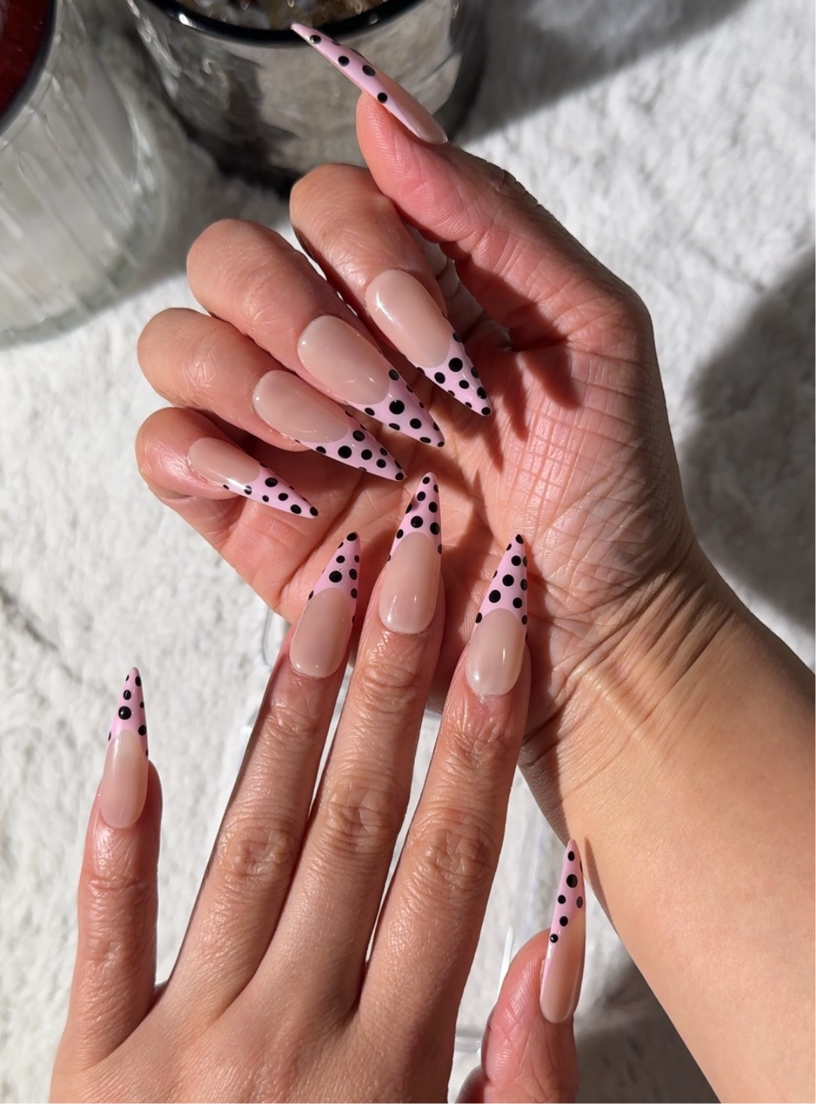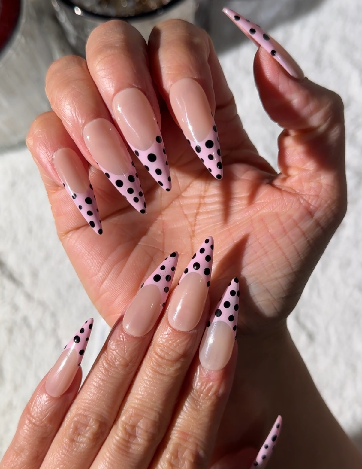 "Softness meets playfulness. This elegant manicure features a universally flattering nude base that elongates the nails naturally. Upon this clean canvas, a playful french tip of soft pink base ,black polka dots dances along the tips.
